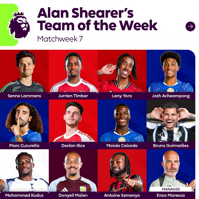 英超第7轮激战落幕后,英超联盟正式揭晓了由传奇射手阿兰-希勒亲自遴选的本轮梦幻阵容,赖斯、凯塞多、库杜斯、拉门斯等球星荣耀入选。